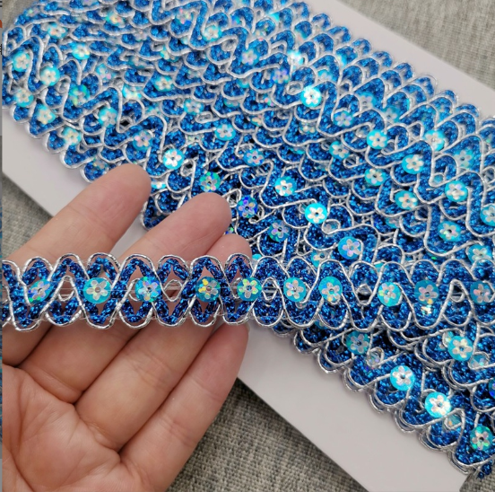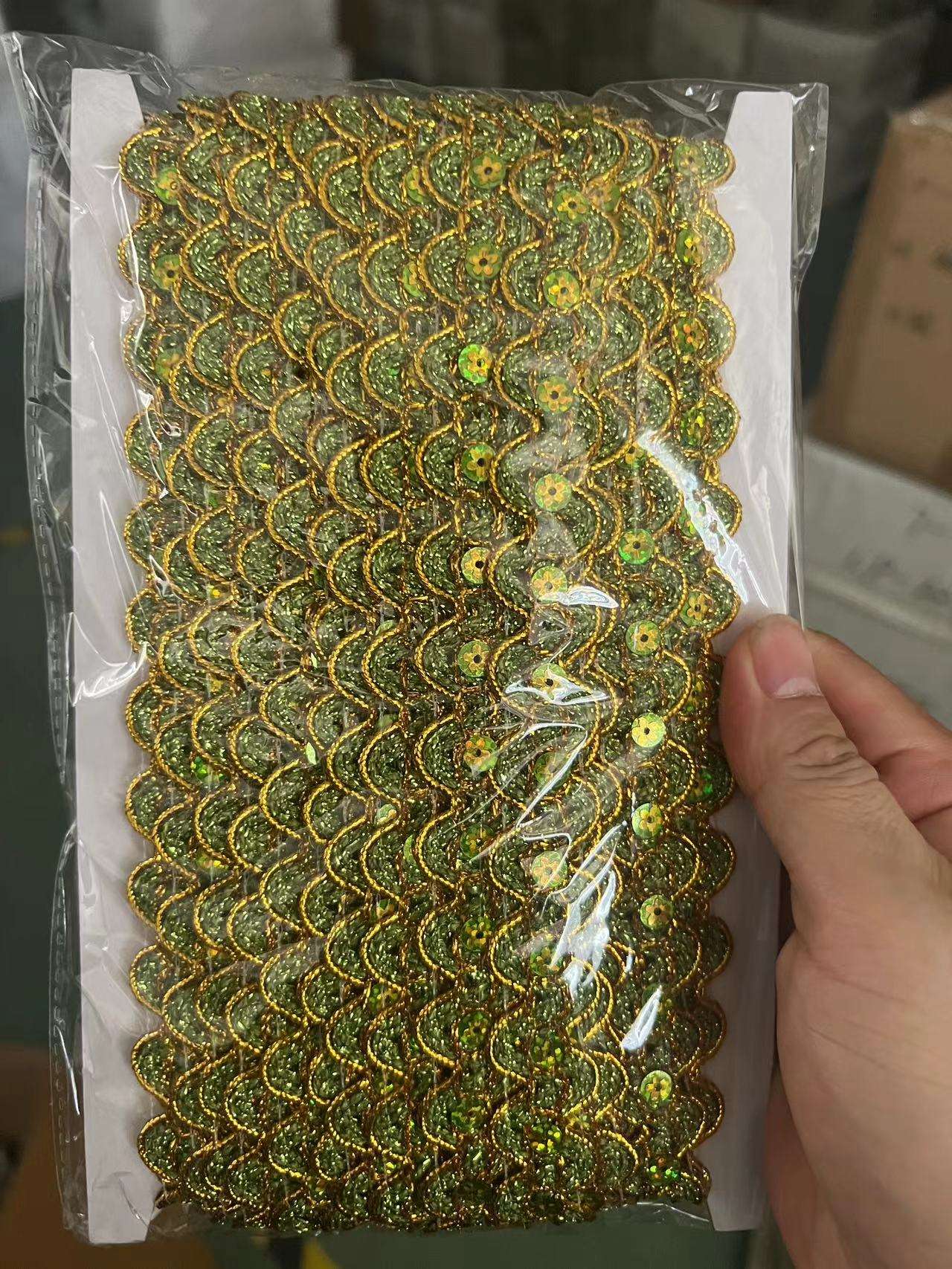 Aksesoris Pakaian Emas dan Perak Border Border Lace Trim Metallic Gold Sequin Bordir Tatting Lace Trim mengadopsi teknik bordir payet logam dan bergabung dengan desain renda berlubang, membuatnya cocok untuk dekorasi aksesori pakaian.