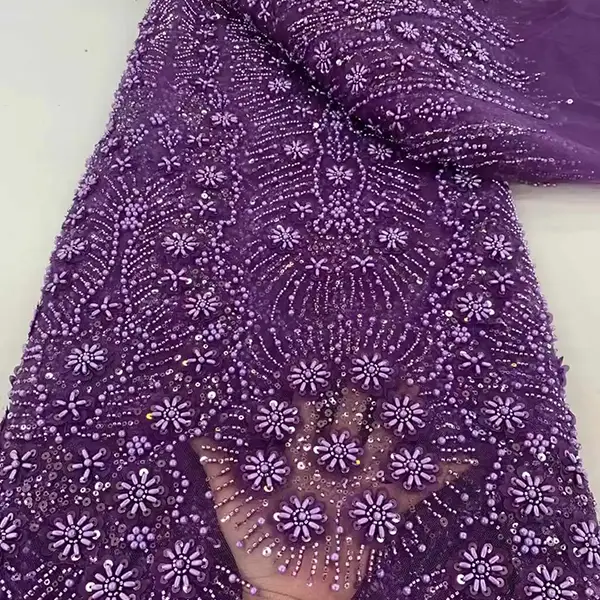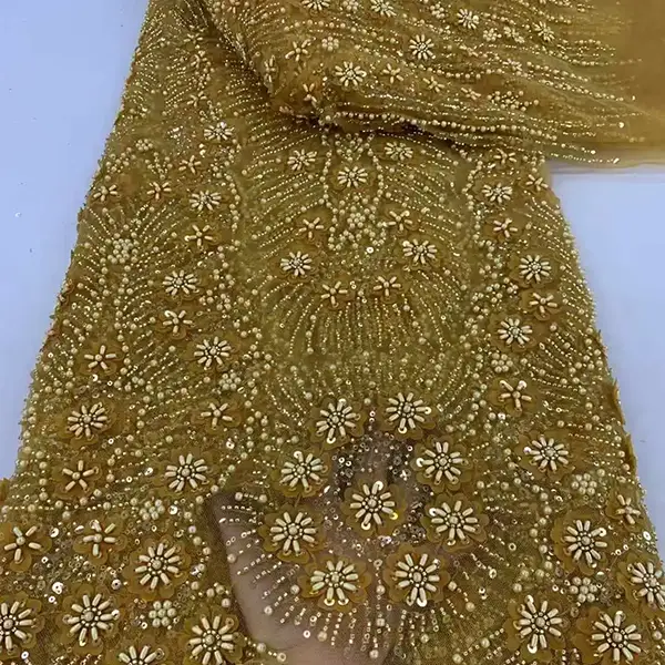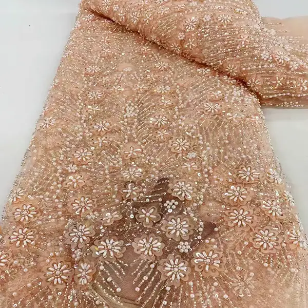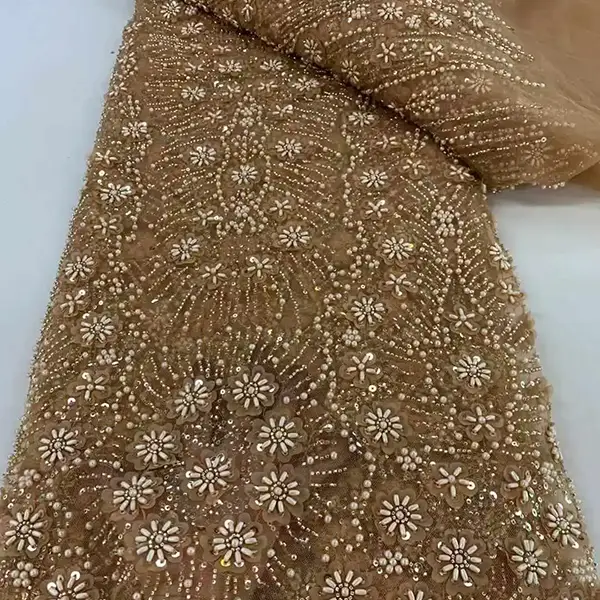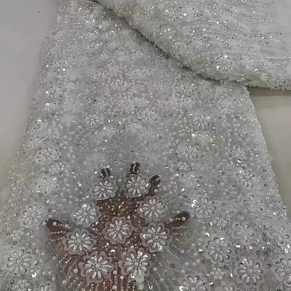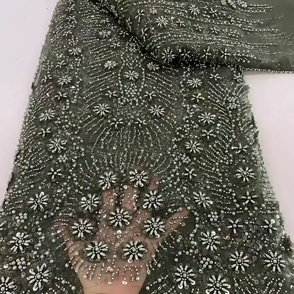 Mewah bordir bordir yang dibuat berat. Jahitan densitas tinggi dan manik-manik yang diterapkan dengan tangan menciptakan tekstur mewah, sempurna untuk gaun pengantin, pakaian malam, dan haute couture. Kualitas elegan, bercahaya, dan premium.