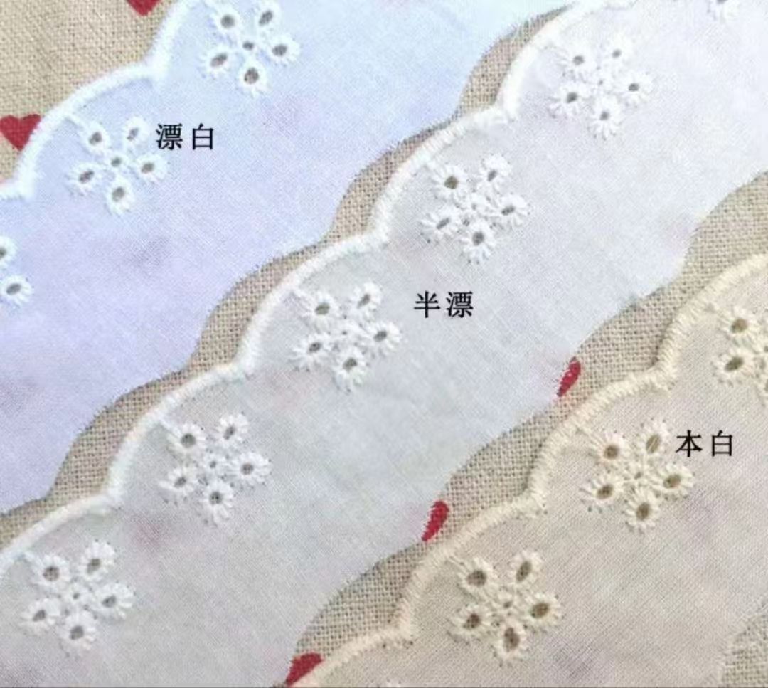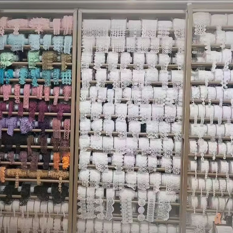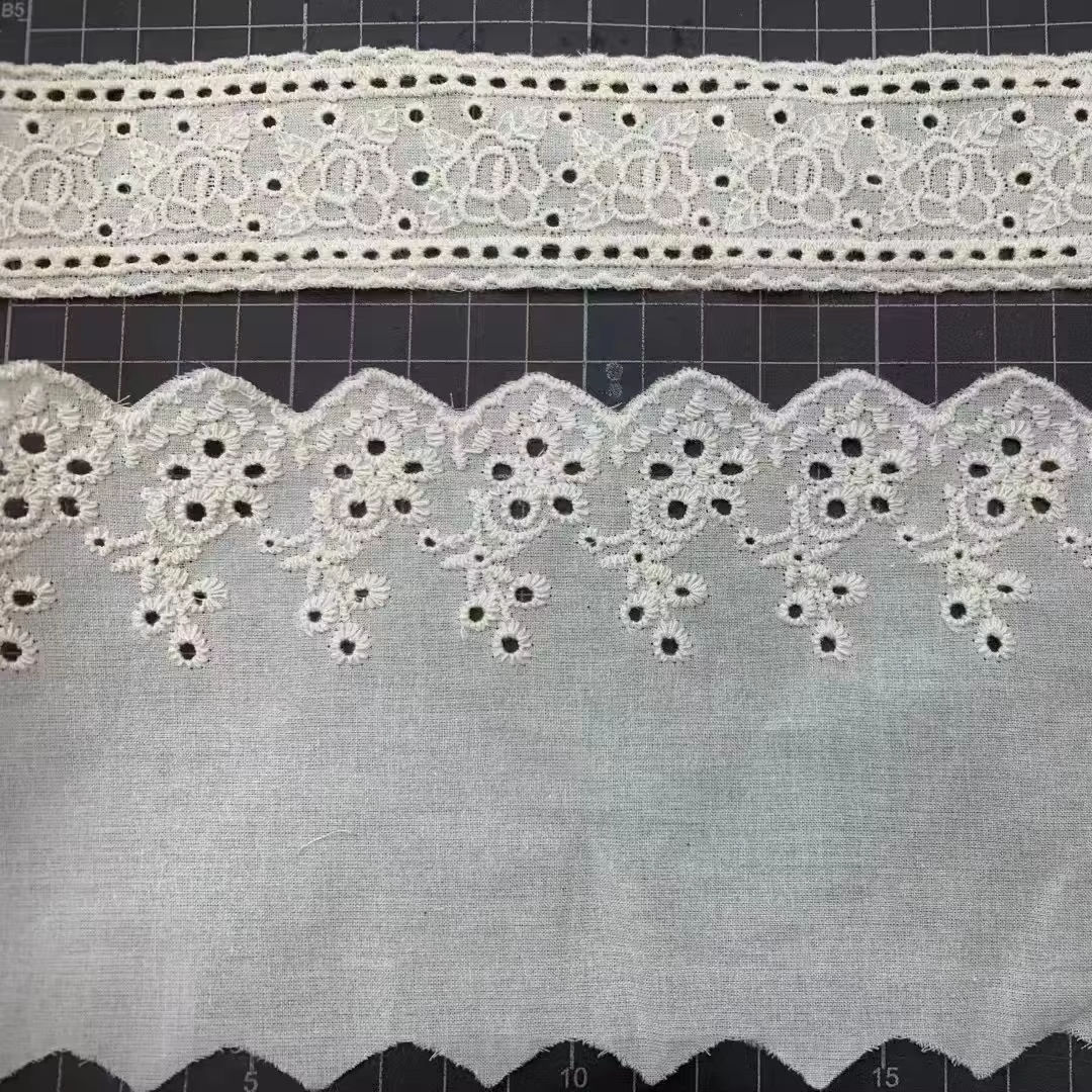 T/C Cotton Lace Triming Bordir Kapas Lace Trim Bunga T/C Lace Tripming Renda Terbuat dari Bahan Polyester-Cotton Blend (T/C), yang lembut dan bernapas, menggabungkan daya tahan poliester dengan kenyamanan kapas. Desainnya mencakup berbagai gaya seperti renda bersulam, potongan bunga dan renda jala, cocok untuk tepi yang indah dan tambalan dalam pakaian dan dekorasi rumah. Ini menawarkan berbagai pilihan lebar dan warna, mendukung kustomisasi, dan memperhitungkan estetika dan kepraktisan.