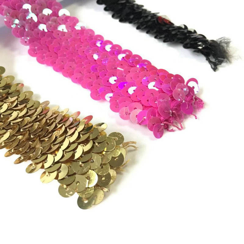 Berbagai lebar bling finish braid elastis payet renda trim tersedia dalam beberapa lebar, fitur basa elastis yang dipasangkan dengan payet mengkilap, memberikan kilau yang brilian. Ini cocok untuk kostum panggung, gaun malam, dan dekorasi sepatu dan topi
